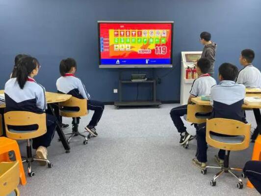 「食堂、辦公室、教室等不同的場所需求運用的滅火器是不同的。」在實驗樓4樓,魏奔奔教師正在給初一年級的同學們介紹不同場景下需求運用的各式滅火器,通過電子互動屏開展模擬消防課堂,讓學生能更加深化地了解消防安全常識。